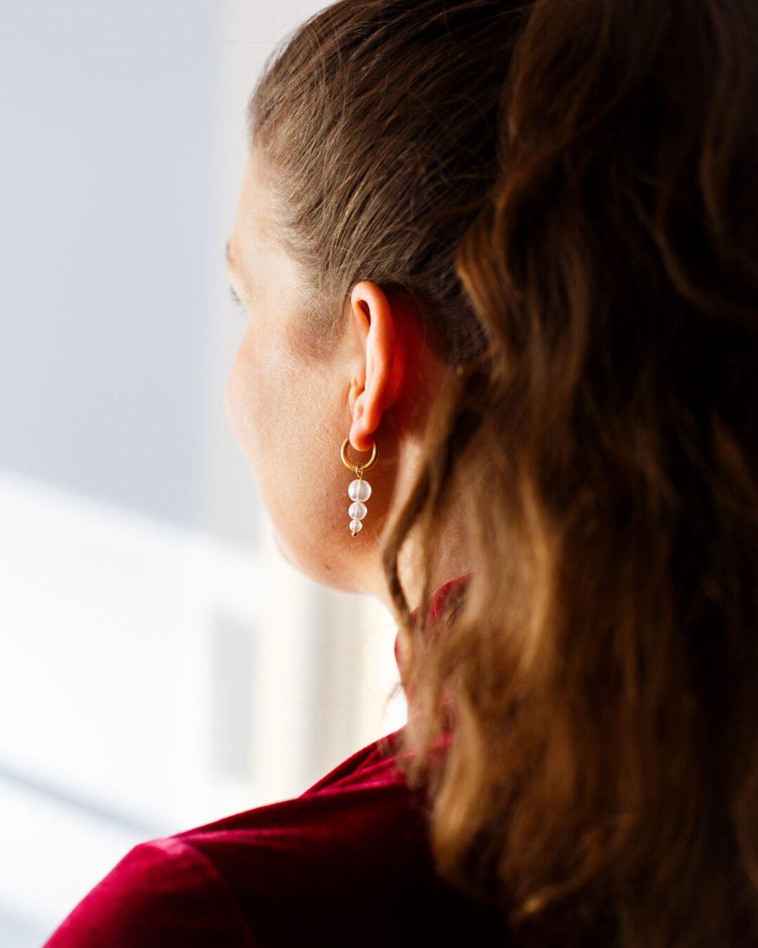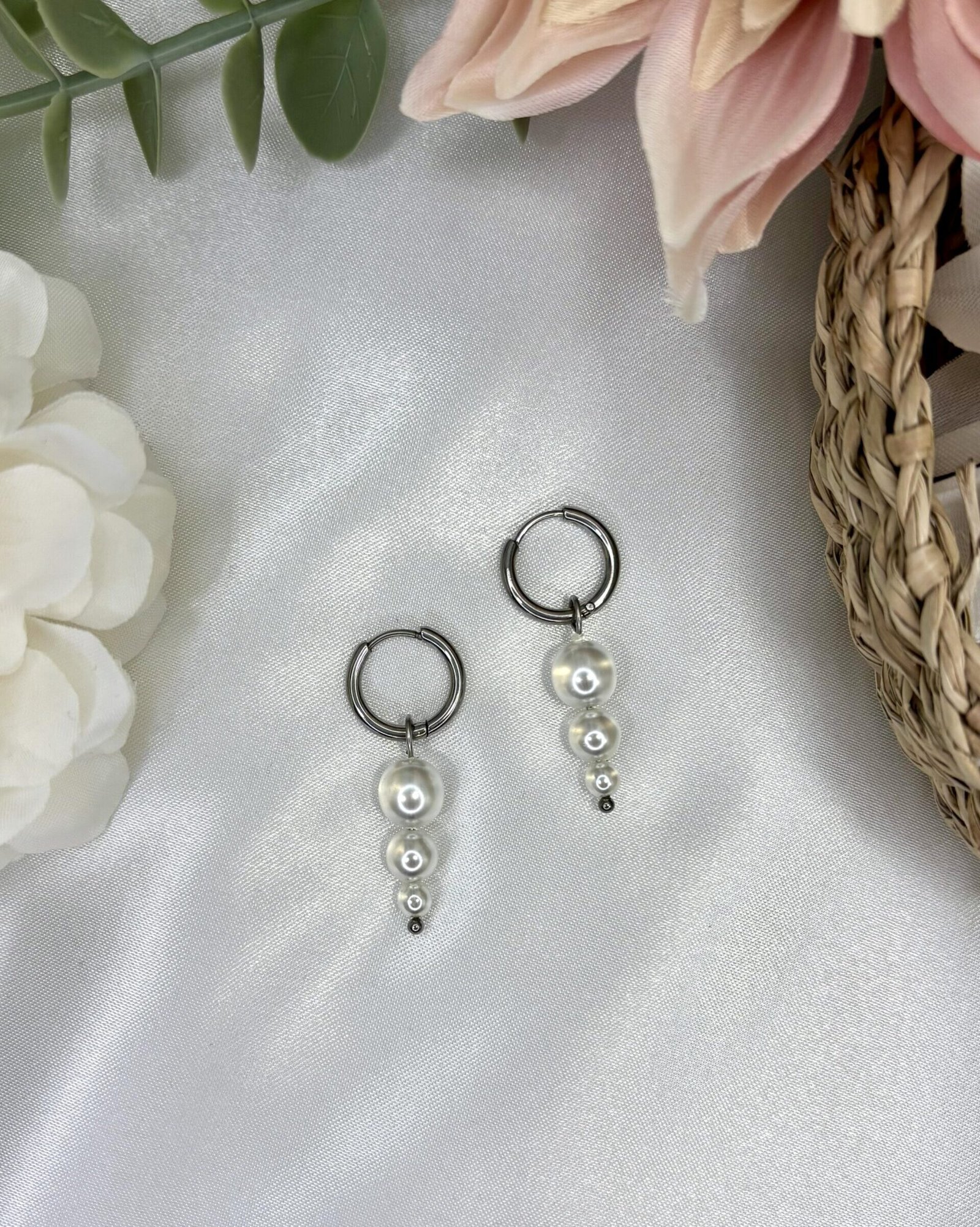 Tämä setti sisältää hopean väriset renkaat sekä kolmesta helmestä koostuvat helmiriipukset.