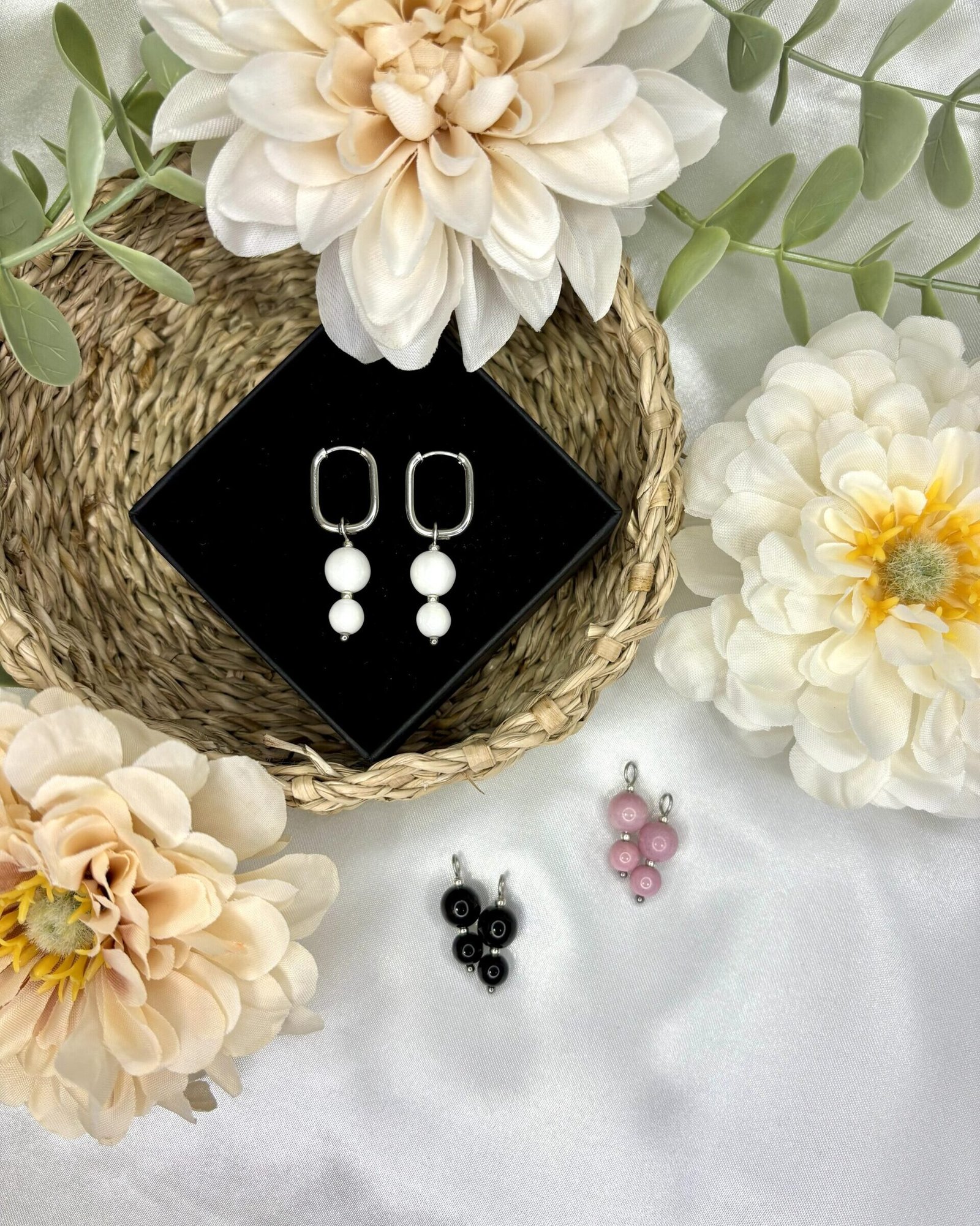 Tämä setti sisältää hopean väriset renkaat sekä valkoiset helmiriipukset.